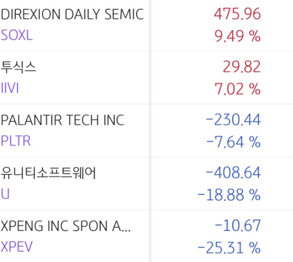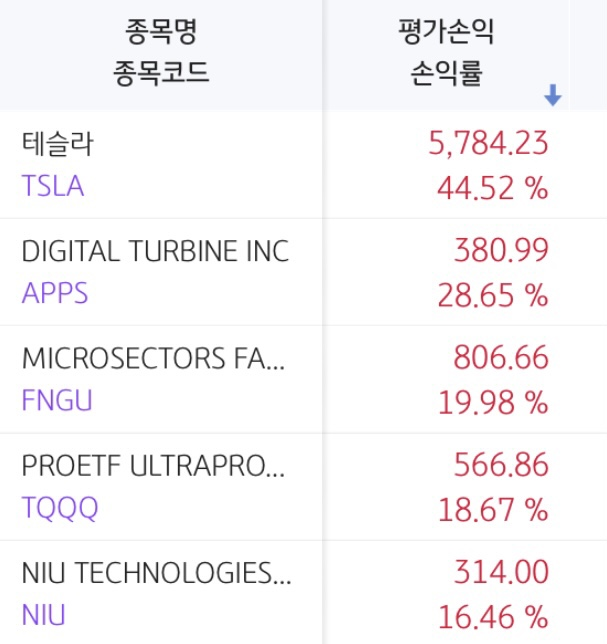 구성 종목 : 테슬라, 디지털 터빈, FNGU, TQQQ, 니우, SOXL, 투식스, 팔란티어, 유니티, 샤오펑