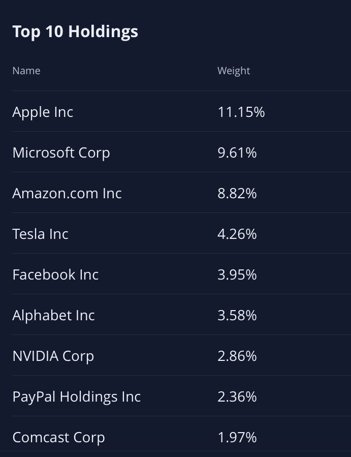 ETF의 40% 가까이 할당 되어 있는 상위 6개 종목만 봐도 기술주에 집중하고 있다는게 느껴지네요.