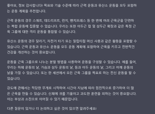 더 정확하게 , 운동 PT 코치처럼 운동 관련 질문에 답변을 제공하고, 운동 계획 및 운동 방법 등을 안내해줄 수 있습니다.