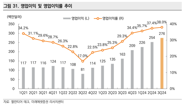 - Rule of 40: 팔란티어는 매출 증가율과 영업이익률을 더한 수치가 **68%**에 달하며, SaaS 기업 중에서도 매우 우수한 성과를 자랑합니다.
