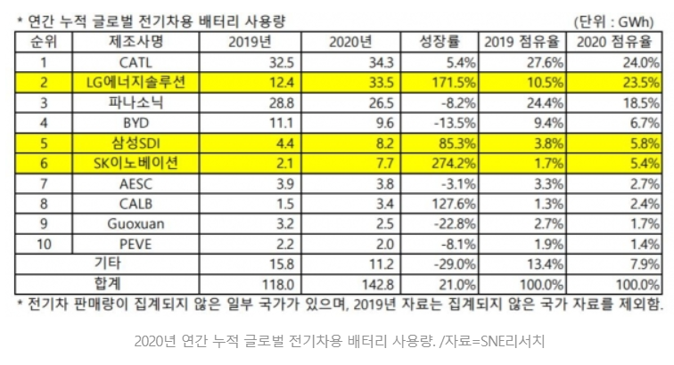 세계 2위 LG화학(LG에너지 설루션), 5위 삼성 SDI, 6위 SK이노베이션 등