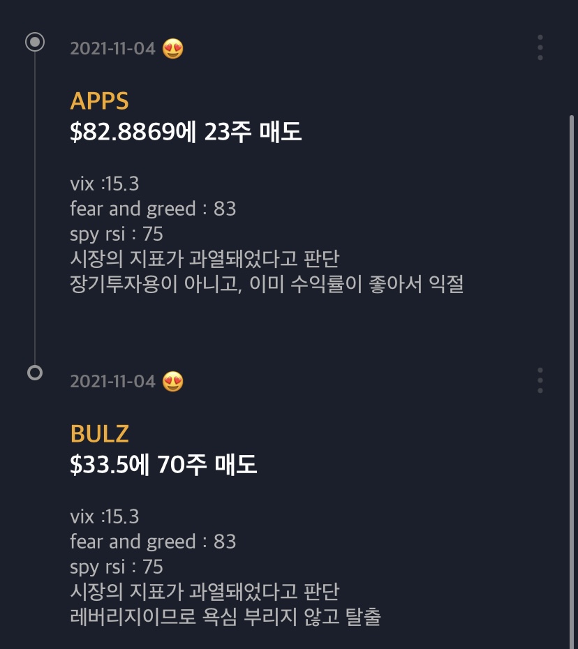 매도 이유 : 시장이 과열됐다고 판단했음(vix:15.3, fear&greed index:83, SPY ETF RSI:75)