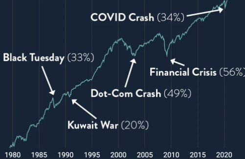 그 안 에는 물론 닷컴 버블, 2008년 금융 위기, 코로나 19 사태 등 많은 경제 위기도 당연히 같이 겪어왔습니다.