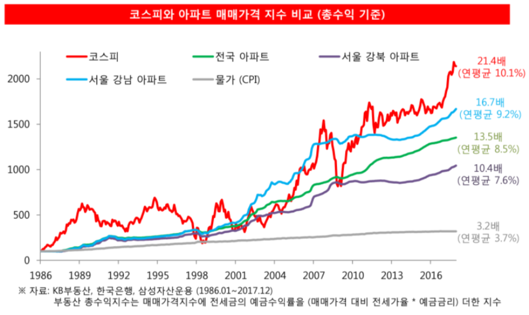 몇 년동안 주식을 끄적여본 결과 주식 수익률도 결코 밀리지 않는데 유독 "부동산"만 강조가 되는 것 같아 궁금해져서 찾아봤습니다.