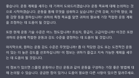 | ChatGPT 똑똑하게 활용하는 법 1 - 나의 PT쌤 만들기(운동코치) (0) | 2023.04.13 |
