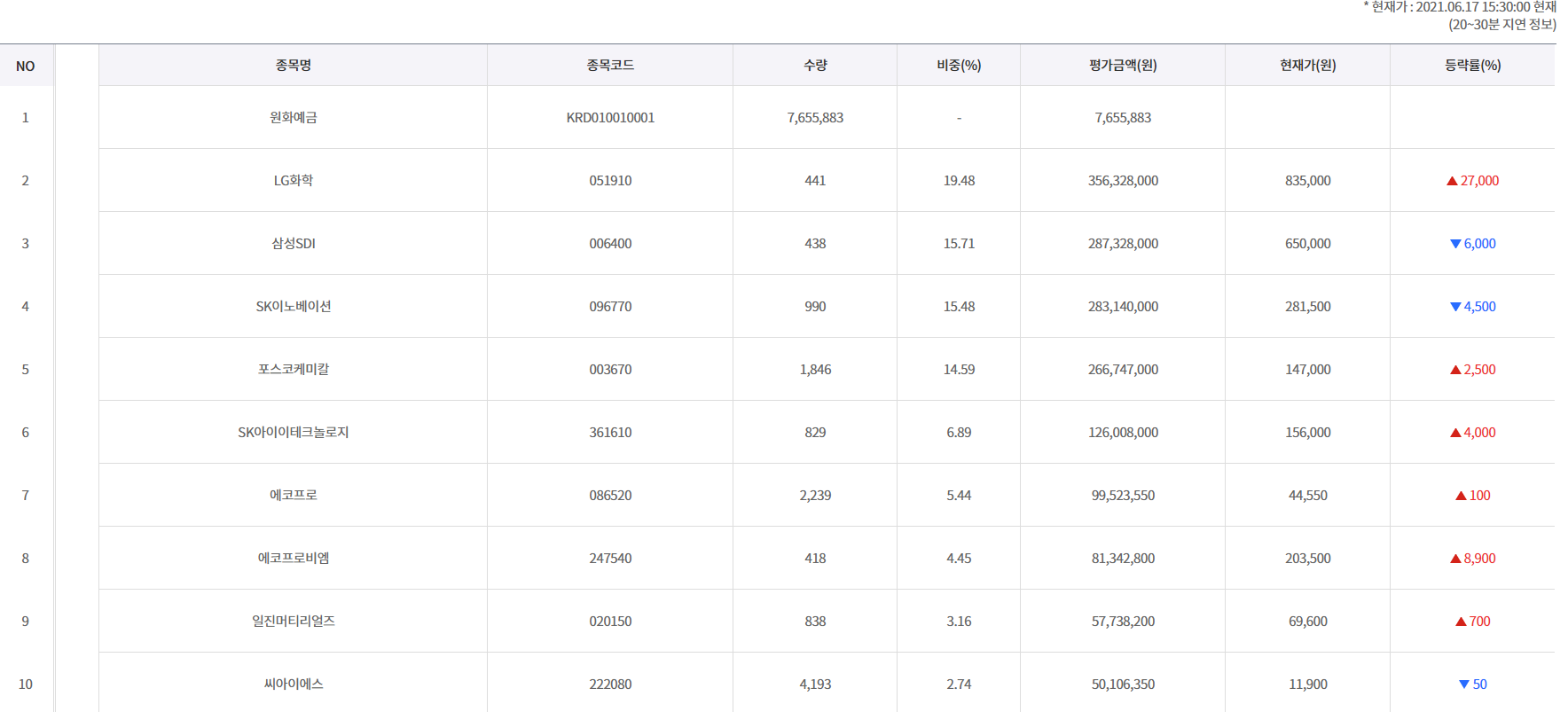 그다음에 포스코 케미컬, 최근에 상장한 SKIET, 에코프로, 에코프로 비엠, 일진머티리얼즈, 씨아이에스 순으로 포트폴리오가 구성되어 있습니다.