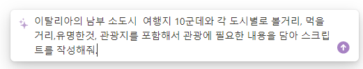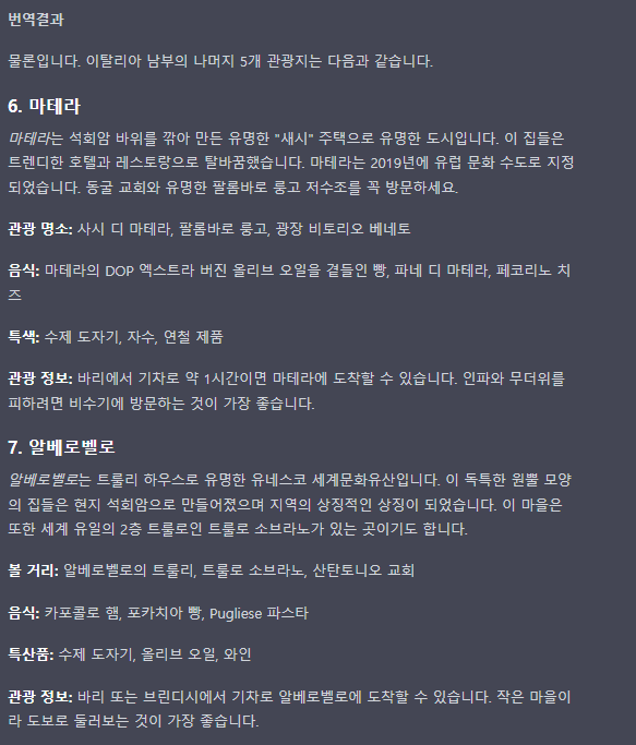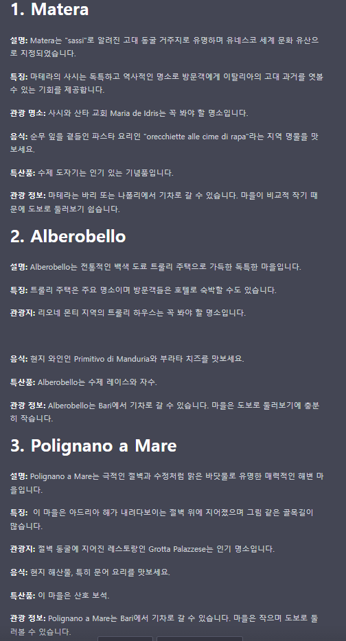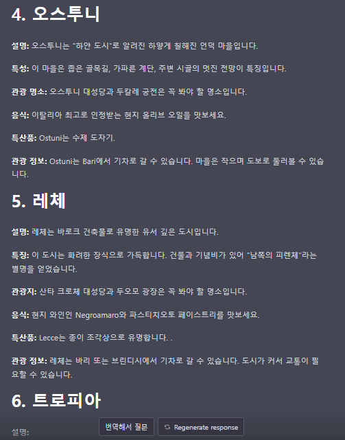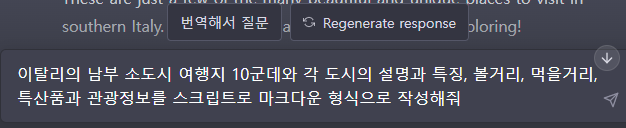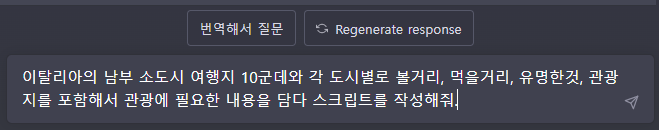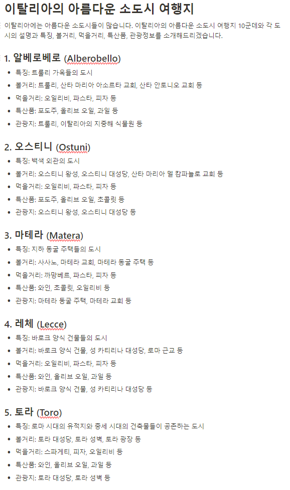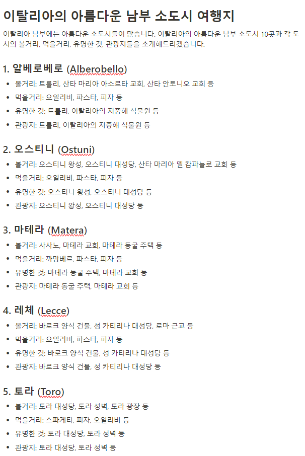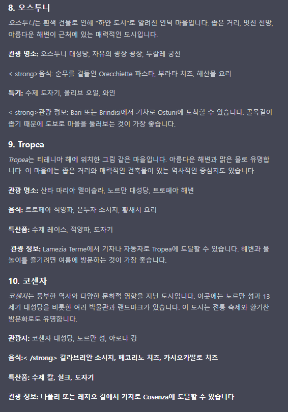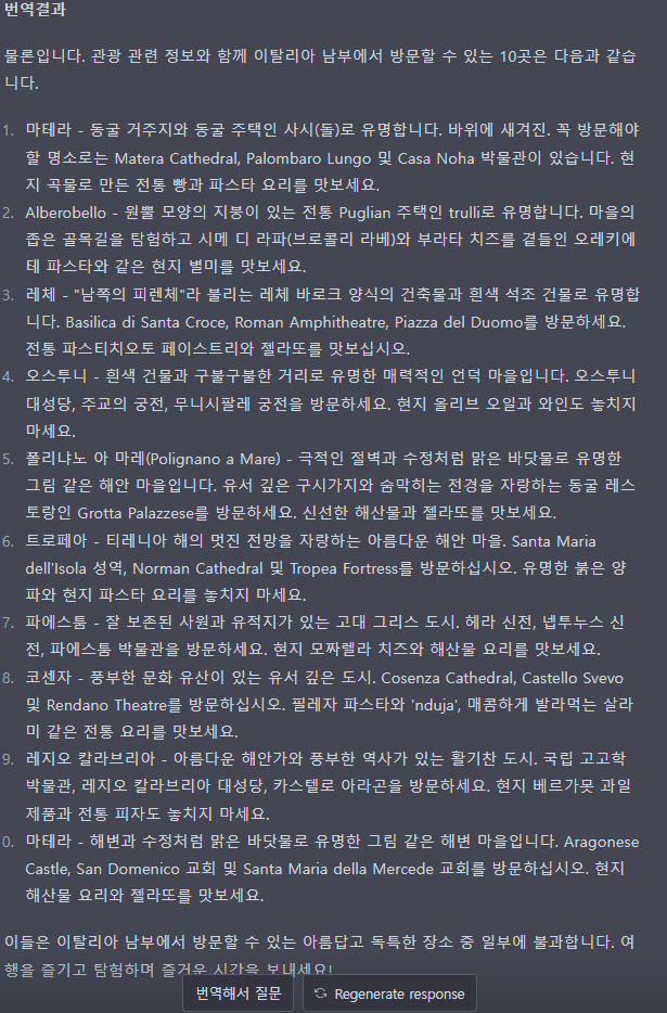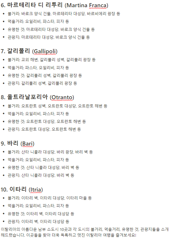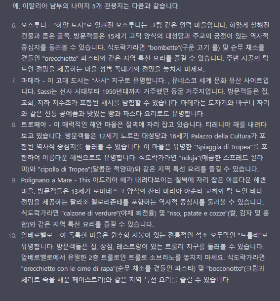 질문 내용은 이탈리아의 남부 소도시 10군데에 대한 볼거리와 먹을거리등의 내용을 알려달라는 내용입니다.